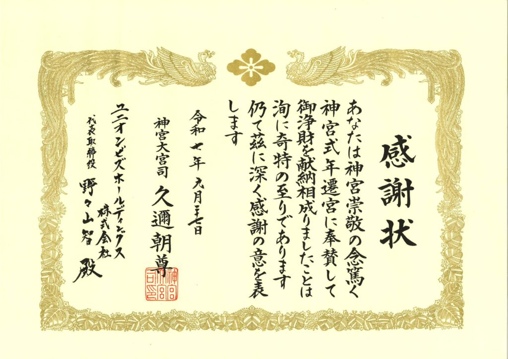ユニオンビズ株式会社は、2025年9月に「第63回 式年遷宮」へ今後も途絶えることなく受け継がれていくよう願いを込めて奉賛いたしました。